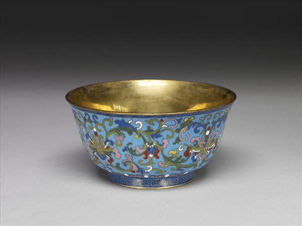 銅胎,敞口微撇,深弧壁略斂,圈足。器身淺藍地,以掐絲技法製作花紋。器外壁滿飾纏枝番蓮花,或盛開、或含苞,花葉色調多樣,有繁盛之趣。近足蓮瓣紋一圈。足牆外壁深藍地回紋,足內露胎,光素無款。