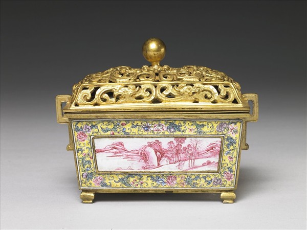 銅胎,鍍金方口,雙雲耳,深壁下斂,四足,帶鏤雕雲龍圓鈕蓋。四壁皆有梯形開光,開光內外均以畫琺瑯技法裝飾。其中兩開光內白地紅彩繪山水景致,左方二人佇立山徑相談,右方則有小橋屋宇,一派清靜山林。另兩開光則以白地藍彩繪飾,一繪漁子橫篙渡水,一繪兩人在水邊坐蹲相對。開光外均飾黃地卷枝番蓮花葉。底外白地,正中央有雙方框藍彩「乾隆年製」雙行四字楷款。附銅膽。