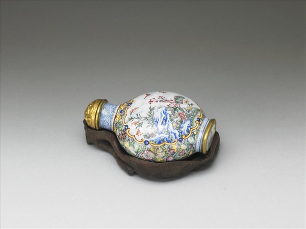 銅胎,扁壺頸繪藍色卷草,雙面開光,一面石竹、菊花、蝴蝶、湖石等,另面繪海棠、天竹、菊花、蝙蝠及湖石,皆有長壽之寓意,兩側滿飾百花錦,底有楷書「乾隆年製」藍款,帶銅鍍金雕花蓋與牙匙,附鏤雕葉形木座。
