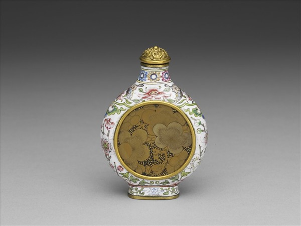 銅胎扁壺,雙面開光內嵌蒔繪黑地描金梅花洋漆片,側面白地彩繪梅花、蝴蝶。底有黑褐色楷書「康熙御製」款,此器結合漆器與畫琺瑯工藝,為傳世罕見康熙時宮廷作坊所作之鼻煙壺。帶銅鍍金雕花蓋與牙匙。