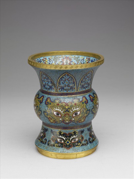 鍍金口,斜頸,圓腹,高圈足。外壁及口沿內以掐絲琺瑯為飾,全器作淺藍地,口沿內飾五彩番蓮紋,外部鋪滿回紋錦地,頸部飾蕉葉紋,內有對夔紋,腹部及圈足外飾獸面紋,腹部上下各有一圈紅藍回紋。口沿鑄刻回紋,器底鍍金,中央有「乾隆年製」鑄刻陽文楷款,外圍雙方框。附木座及木盒。