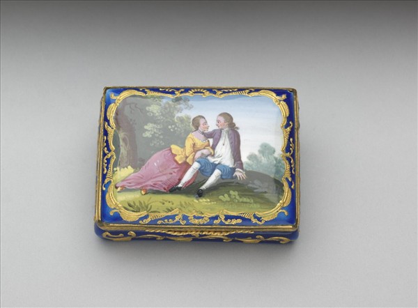 銅胎畫琺瑯掀蓋盒,器身藍地描金繪渦捲紋裝飾,盒蓋繪席地而坐男女談情,口緣鑲雕花鍍金銅口。依其形制與裝飾風格,應為十八世紀後半英國Battersea式琺瑯。