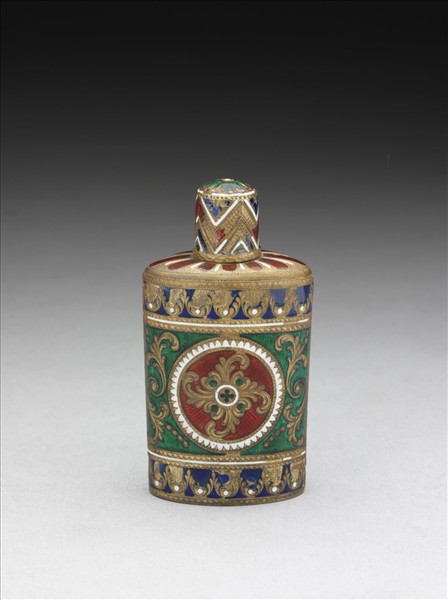 長方扁瓶,瓶身鏨滿各式圖案與卷葉紋,上有紅、綠、藍三色透明琺瑯,及白色琺瑯裝飾,配以四色琺瑯鏨刻蓋與金屬匙,英國十八世紀後半有類似風格琺瑯瓶。