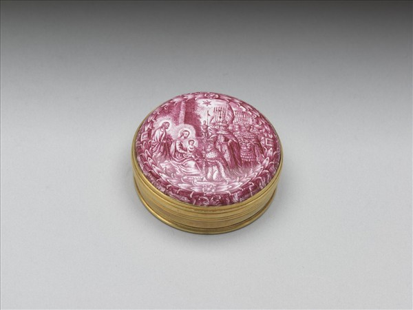 圓形銅蓋盒,蓋嵌雙面胭脂紅琺瑯片,描繪《路加福音》第二章中,天使傳報喜信和牧羊人的讚美之情節,蓋正面畫耶穌誕生於伯利恆;蓋內畫天使手裡拿著「天上榮耀歸於神,在地上平安歸於祂所喜悅的人」標語。此件單色琺瑯片,可能是英國十八世紀後半結合版畫與點畫發展出的轉印法製作而成。