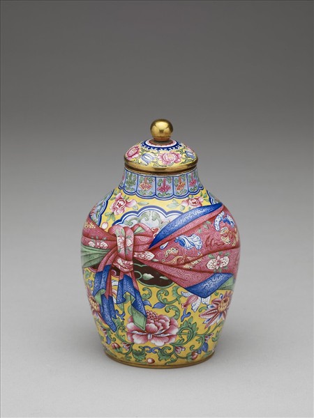 銅胎,圓冠式蓋鍍金球鈕,短頸,斜肩,扁橢圓式斂腹。琺瑯彩,蓋表黃地朵花連枝紋,鈕底飾紅邊白底點紋,外圍再繪一圈藍底白邊如意雲紋。頸藍地圍飾靈芝紋,腹飾各式纏枝花卉,近肩處四開光。於四開光位置處,繪飾著紅面藍邊的包袱巾,裹繞於器腹上;紅袱巾,底飾菊花的龜甲錦地間以蝙蝠,其上再繪飾花、蝶圖樣等,袱巾背面繪青綠色寶相花。器底綠釉,繪製一圈轉枝菊花紋,中間為藍色雙圈交疊,圈內白地書墨色「乾隆年製」款。