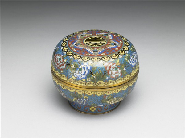 銅胎,平頂扁圓盒,子母口,弧形壁,高圈足。盒內外皆施藍釉地。蓋頂平坦飾一圈黃地鏤空圓壽紋,以壽字為中心圍繞五隻蝙蝠,呈現五蝠捧壽圖樣,外緣以一圈黑邊黃地紅點如意紋飾之。蓋壁及蓋身以卍字不斷連紋為錦地;蓋壁繪飾芙蓉花卉,蓋身則飾以各色芙蓉、菊花紋飾。蓋與器身對合處鑲鍍金銅邊,沿邊裝飾如意紋。圈足壁則以四辦花草紋飾之,足底沿以鍍金銅邊鑲之,底部施藍釉。