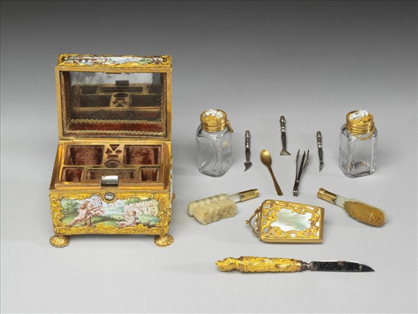 盒裝修容組件,以袖珍便攜形式組裝。此類匣盒內大多配置小鏡、盛裝香水或香料的玻璃瓶,刀、剪、鑷子等。盒之外壁或鑲嵌畫琺瑯片,或嵌螺鈿、瑪瑙、各色寶石,呈現歐洲十八世紀華麗裝飾風格。