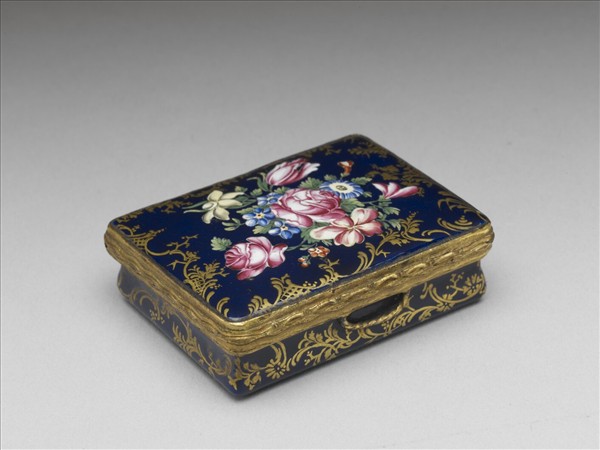 銅胎畫琺瑯掀蓋盒,通器藍地,描金花草紋裝飾,盒蓋上彩繪各色花卉,盒內白色琺瑯上有描金花鳥,可能是英國Battersea式琺瑯,但也可能為歐陸地區所生產。
