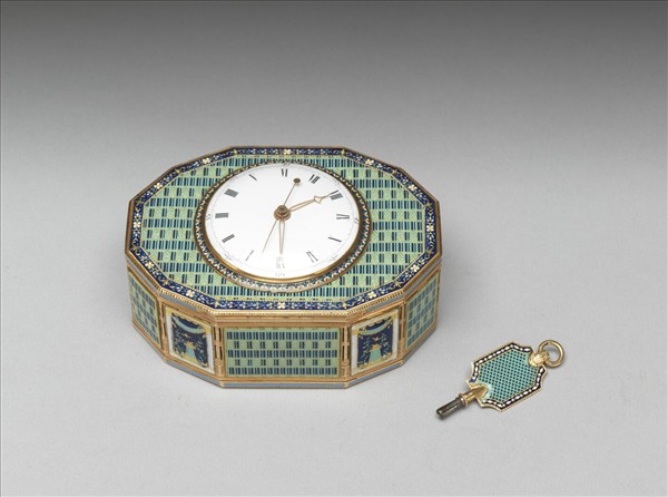 琺瑯鑲錶八角形音樂上下蓋鼻煙盒,上蓋嵌表,底蓋掀開以存放鼻煙。盒滿飾藍綠相間方格琺瑯,並以藍、金、綠三色刻金箔琺瑯裝飾花邊、花瓶等紋飾,底有琺瑯畫,描繪年輕音樂家在丘比特協助下,正吸引著少女。資料顯示,此件鼻煙盒,可能是十八世紀瑞士琺瑯鐘表名匠Jaquet Droz的作品,專為銷售中國市場製作,由倫敦Recordon & Dupont, London銷售。盒內有戳記法國純度戳記與課稅標章,時間約在1774年。錶背有"Recordon & Dupont, London"刻字。1860年10月英法聯軍時,曾從圓明園中掠奪形式相同之鼻煙盒。