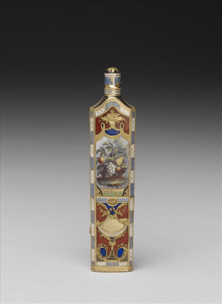 瘦長扁瓶,以鏨花與各色琺瑯裝飾點綴,瓶中嵌花果琺瑯畫,一側瓶身下方有秘密隔間可放鼻煙,色彩豐富,裝飾細膩,約為十八世紀末瑞士日內瓦製作。
