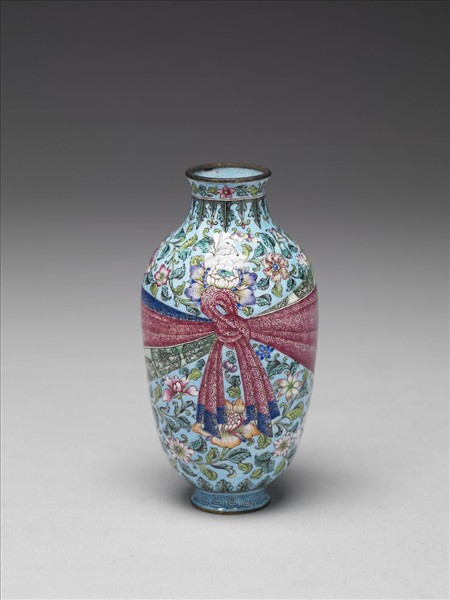 院藏嘉慶銅胎畫琺瑯僅二件,此為其一。短頸斜肩小瓶,全器淺藍色地,以墨色鉤邊彩繪,銅鍍金口沿,頸飾花葉紋,其下為蕉葉紋,器身有繪纏枝花卉,腹下緣有蕉葉紋,圈足飾回紋;瓶身為紫粉色八角錦地紋錦袱包覆,有藍色纏枝花邊與綠色團花紋內裡;底施白釉,有雙方框「嘉慶年製」楷書紅款。據其款式,應為廣琺瑯,配色清麗,畫工細緻,雖有部分釉色不均,但仍為罕見嘉慶畫琺瑯之精品。