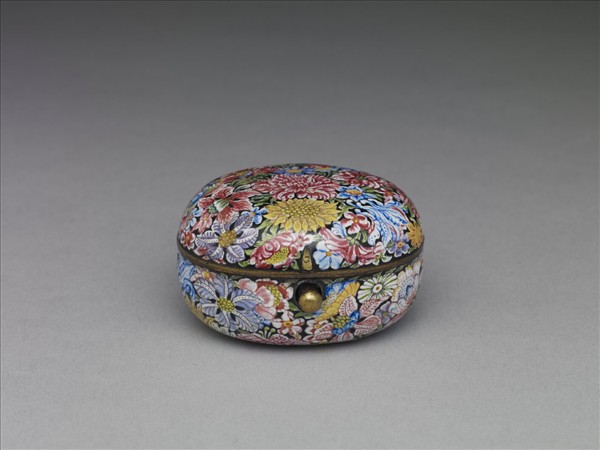 橢圓形掀蓋銅盒。器表通體先上一層白色底釉, 再以紅、黃、藍、白等色滿繪向日葵、水仙、雛菊等百花, 餘填黑色地釉。盒內罩淺藍色釉, 蓋沿寫「雍正年製」(1723-1735)單行黑料楷書款。紋飾設計與光影點染, 深受西洋風格影響。