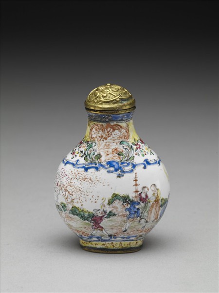 頸部開光繪風景及花葉紋,瓶身通景式西洋人物圖。帶雕花銅蓋與骨匙。底有楷書「嘉慶年製」藍款。器形欠端整,畫工草草,上色不勻多流釉,象徵畫琺瑯工藝的式微。在〈清 嵌玉八角形木匣〉百什件中收藏。
