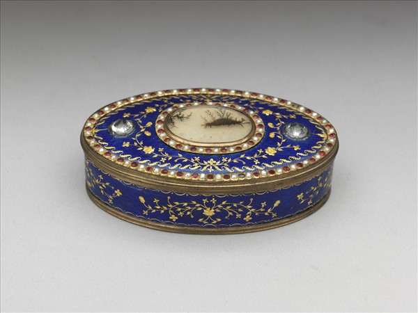 橢圓掀蓋盒,蓋周圍嵌珍珠與紅色玻璃,中央嵌草蕨瑪瑙外鑲珍珠與紅色玻璃,兩旁鑲透明切割玻璃,餘飾藍色透明琺瑯,並有金箔雕花裝飾。