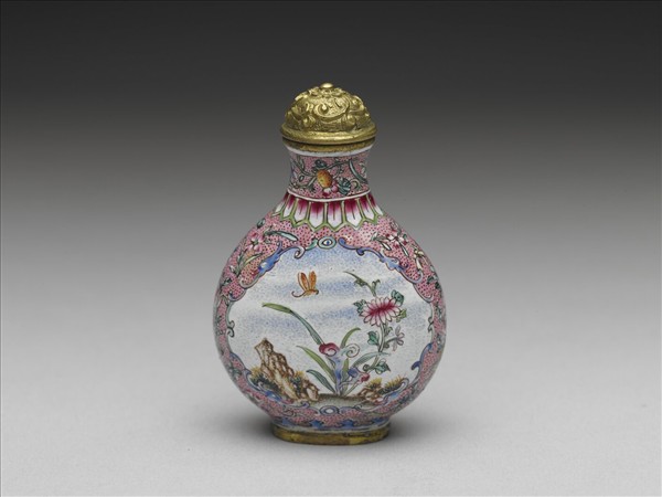 扁壺雙面開光繪靈芝、花、石與蜻蜓,餘以粉色地繪轉枝花果紋,底有楷書「乾隆年製」黑款,有銅鍍金雕花蓋與牙匙。應為廣琺瑯。