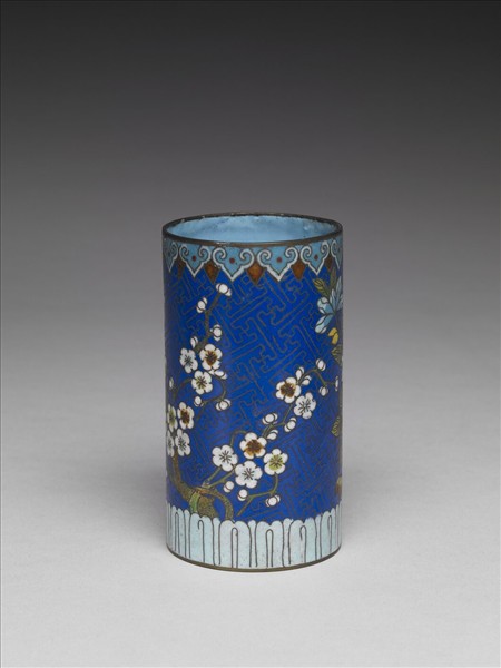 圓口,深直壁,平底,器內施淺藍釉。全器外壁施深藍釉,口緣飾一圈如意雲紋,壁飾枝幹糾結之梅樹及萬字不斷錦,枝幹佈滿含苞、盛放花朵。器內施淺藍釉。