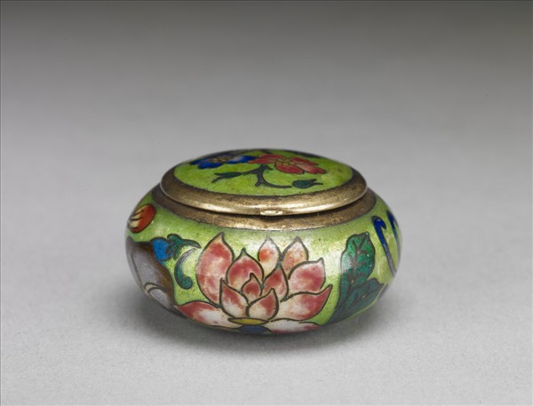 圓口,鼓腹,圓蓋以活頁與盒身相連。口緣及蓋緣包銅邊,器腹施翠綠色釉,光素無紋。蓋面飾一折枝花卉。蓋內陰刻陽文「北京/志成/足銀/峰」字樣。
