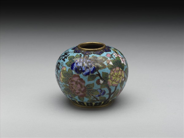 銅胎,蘋果形罐,器內露胎,器表淺藍地,口周圍飾如意雲頭紋,腹飾牡丹(另一為梅花)及詩句︰牡丹雖富貴,可惜獨趨前,一旦冰霜至,花開不似先。(另一為︰寒梅多傲骨,不學牡丹紅,似彼純臣節,花開獨在冬。),以雲紋錦填白,部份雲紋成橫長縱短的蝸牛形,係十九世紀中期前後的文物。各附盛水之勺一。
