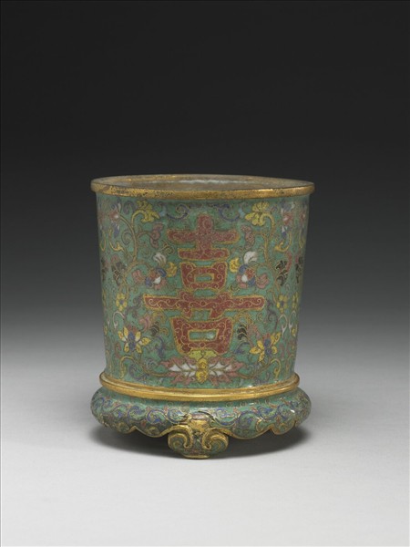 鍍金圓口,深直壁微斂,作內捲式几式座,座下接四如意形足。全器為綠地,以掐絲技法於外壁飾滿各式纏枝花葉紋,其間平均飾四紅色「喜」字,字上飾金色曲線紋並帶金邊框。器底露金屬胎,雙方框內陰刻「乾隆年製」。
