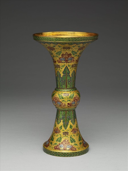 器形仿古銅酒器觚的形制,侈口下收,中段圓腹,下方漸寬成撇足狀,瓶底圈足。器表鏨刻細密的弦紋,在黃色透明釉下清晰可見,圖案上下對稱,口沿、腹部上下緣及足緣飾幾何紋,口緣下方、圓腹及近足處為圖案式的各色大小番蓮朵花,圓腹之上下飾綠色蕉葉紋。器底白地書藍色「乾隆年製」雙方框雙行宋體字款。故琺975~979為一組五供。