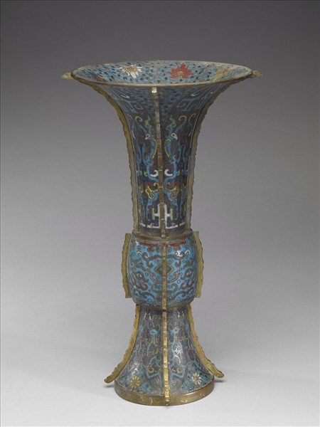 仿青銅器之觚型制,喇叭口外撇,長脰,鼓腹,高圈足外撇。全器四邊出戟,邊緣成幾何狀。全器為淺藍地,以掐絲技法於脰與足飾蟬紋與花卉,腹飾獸面紋,口緣內飾番蓮紋。器底露胎,刻十字形紋飾。