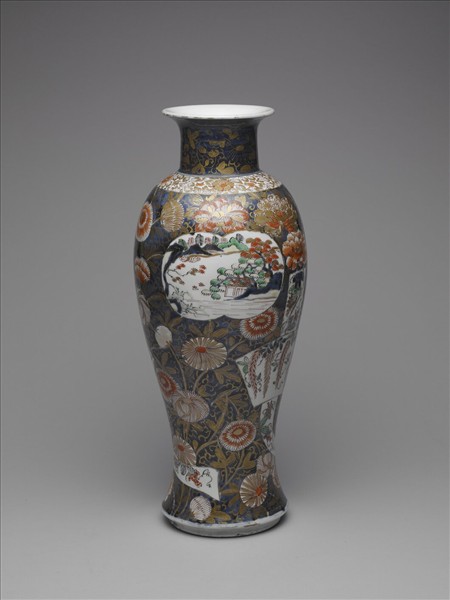 這件仿洋瓷瓶高五十四公分,器表裝飾的紋樣若分三段來看,可見頸部以霽青為地,再加飾金彩花葉紋,頸肩交接處另外描繪一圈白地金彩纏枝花葉,其中幾個花朵又以紅彩點綴。肩部以下至底足仍以霽青釉為底色,滿繪牡丹、菊花及圓形花朵。枝葉密佈交錯間,又排佈兩個相對的雙圓形及一個穿插其中的扇面飄帶形開光。由兩圓相交勾勒而成的雙圓形開光,內飾遠山樹林與近岸房舍,開光輪廓形似十八世紀清宮製作名為雙緣寶盒的漆器。而由扇面中穿飄帶形塑而出的開光,長條形內繪葡萄藤蔓,扇形則裝飾紅彩紫藤類花朵。再就器形來看,這件作品直頸、垂肩、長碩腹的造型,和院藏另一件帶「大明成化年製」款的〈青花百壽瓶〉相似,儘管兩件瓷瓶底部外撇下接圈足的特徵也雷同。仿洋瓷瓶器底白釉失透略顯乳濁,足徑與底徑並且存在一圈間距,尤其底面出現的三枚支釘痕,令人聯想到為防止底部塌陷而使用支燒具支撐的日本伊萬里瓷器,而反映出仿洋瓷瓶與青花百壽瓶分別出產自不同窯口的可能性。