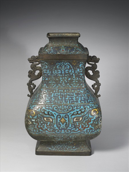 鍍金長方口,雙龍耳,束頸,鼓腹,撇圈足,帶長方圈足之梯形蓋。全器外壁為淺藍地,以掐絲技法於頸飾相對夔龍紋,肩飾拐子龍紋,腹飾獸面紋。器內壁口緣處亦為淺藍地,帶掐絲紋飾。器底露胎。附長方形木座。