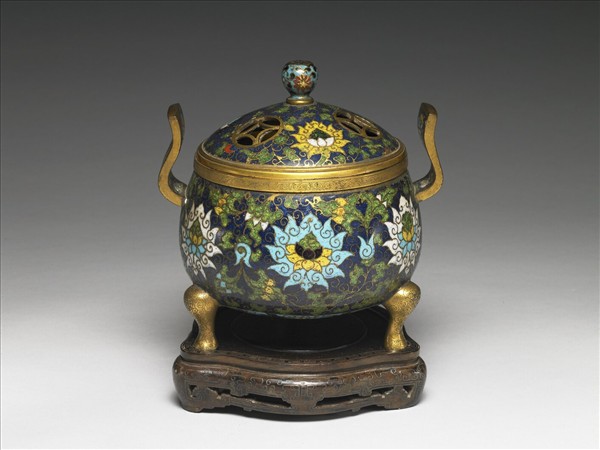 圓口,垂腹,雙板形耳,三足,帶一寶珠鈕圓頂蓋。全器以掐絲琺瑯為飾,深藍地,全器飾番蓮紋及捲葉紋,耳飾朵雲紋,蓋有古錢形鏤空孔,口緣鏨刻卷草紋,足鏨刻番蓮紋,足及口緣露胎鍍金。附嵌金銀絲拐子龍紋木座一。