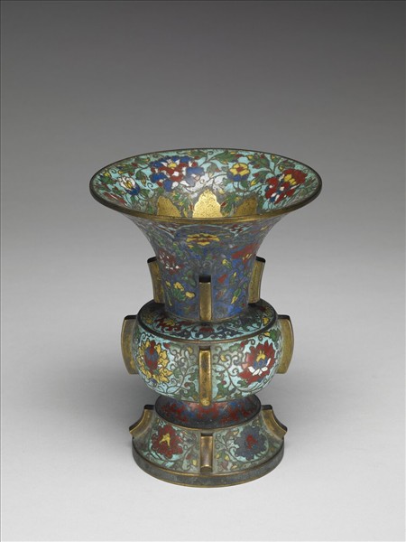 侈口,長頸,鼓腹下緣內折,階形外撇圈足。全器以掐絲琺瑯飾淺藍地番蓮紋,口內飾鍍金蕉葉紋,頸部有深藍色蕉葉紋內飾番蓮紋,圈足外飾回紋;四邊出戟,底部鏨刻十字杵紋。口沿、出戟、圈足內及外底露胎鍍金。附如意雲足圓形木座一。