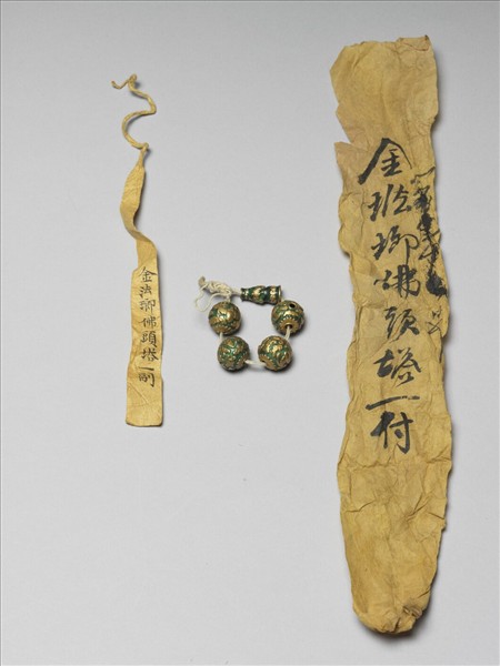 琺瑯佛頭四與佛頭塔一,以棉線串起,佛頭及塔上皆以金彩描繪蝠紋、朵雲紋與菊瓣紋。