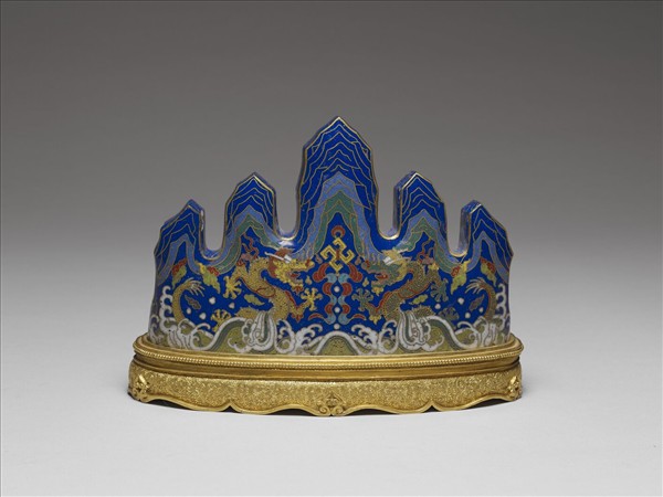 銅胎,五峰山字形筆架,或直稱為筆山。器表藍地,兩面均飾雙龍拱卍彩墜和壽山福海等,鍍金座鐫卷枝蓮花,器底鑄淺浮雕式雙龍拱去地陽文「大清乾隆年製」長方框三行楷書款。