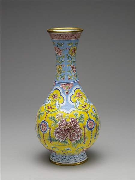 長頸瓶,侈口,縮頸,梨形腹,矮圈足外侈。器內施白釉,器外黃釉地,口緣鑲銅釦。外口沿紅色卷草紋一道,頸部淺藍地上畫四季花卉,肩上淺藍色如意雲紋一周,各雲紋間畫飾蓮花及垂墜瓔珞紋。腹部畫有藍、紅及黃色牡丹,底邊纏枝蓮花一周,圈足上畫藍色波濤紋。外底心書「康熙御製」雙行雙方框藍料仿宋體款。
