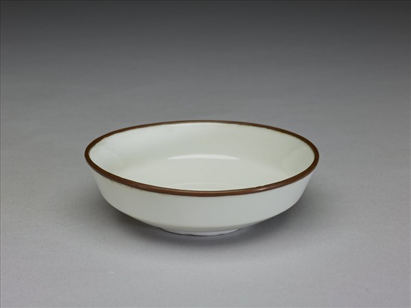 侈口,深壁,矮圈足。薄胎骨,通體牙白色釉,樸素無紋飾,口沿加鈐銅邊。