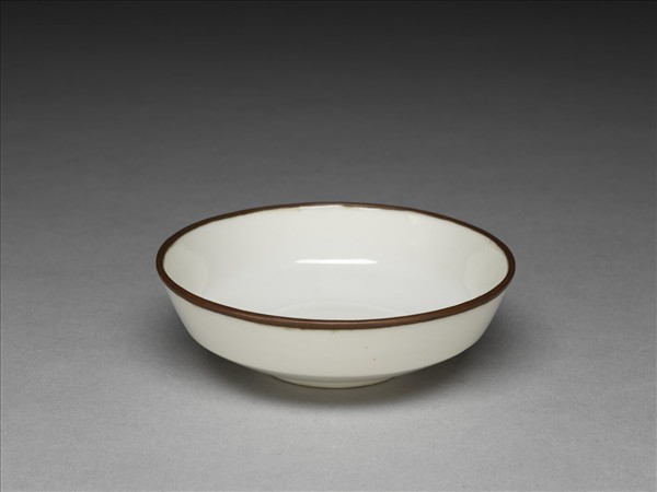 侈口,深壁,矮圈足。薄胎骨,通體牙白色釉,樸素無紋飾,口沿加鈐銅邊。
