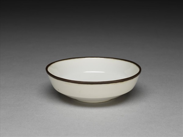 侈口,深壁,矮圈足。薄胎骨,通體牙白色釉,樸素無紋飾,口沿加鈐銅邊。