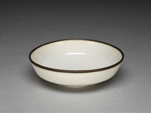 侈口,深壁,矮圈足。薄胎骨,通體牙白色釉,樸素無紋飾,口沿加鈐銅邊。