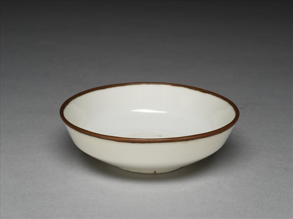 侈口,深壁,矮圈足。薄胎骨,通體牙白色釉,樸素無紋飾,口沿加鈐銅邊。