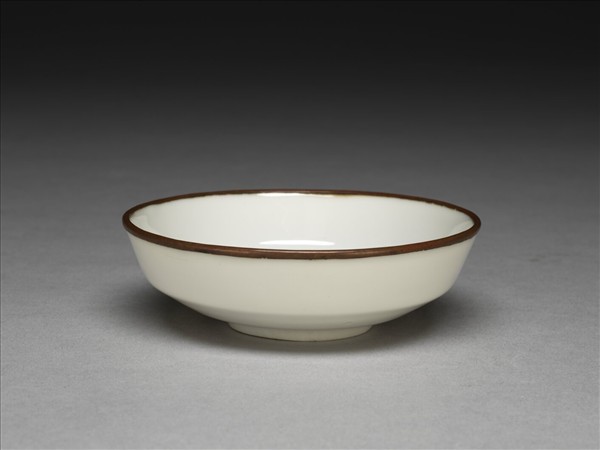 侈口,深壁,折腰,矮圈足。薄胎骨,通體透明釉,樸素無紋飾,口沿鈐銅扣。