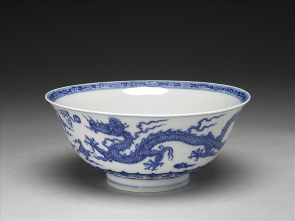 侈口窄唇,深壁,矮圈足。薄胎白釉,口唇上畫勾雲紋一周,碗心畫雲龍一條,周壁純白無紋飾。外壁畫趕珠龍二條,加飾朵雲,底邊畫蓮瓣紋一周。口足內外分飾青線九道。