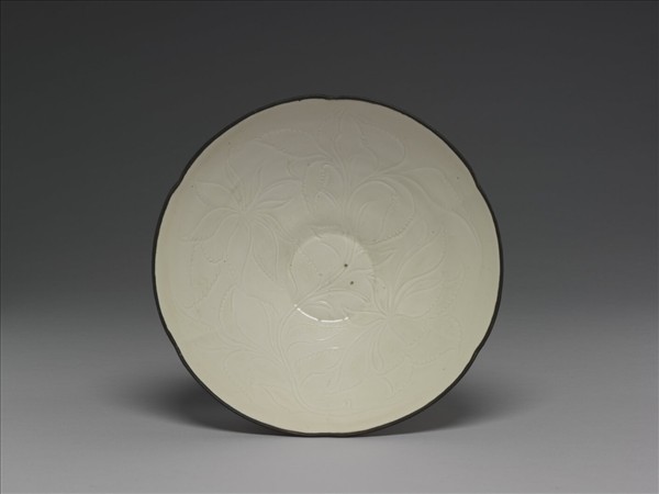 六花口大碗,斜壁微弧,圈足,足牆微高,足端釉似遭磨去,口緣鑲銅稜釦。碗口瓣曲淺而外壁於呼應花口低陷處向內押入,使如花瓣相偕的花式碗。碗內,通壁與底以劃花呈現一折枝牡丹,花枝分岔傾敧,二朵盛開大花搖曳,葉片也張佈伸展。全器紋飾以線狀刻線直刀雕刻,並以齒狀邊緣裝飾花葉;細篦劃紋分刷飾於花瓣葉片上。此種特殊刻劃法也見於陝西藍田呂氏家族墓(1074-1117)出土的白瓷盒面。