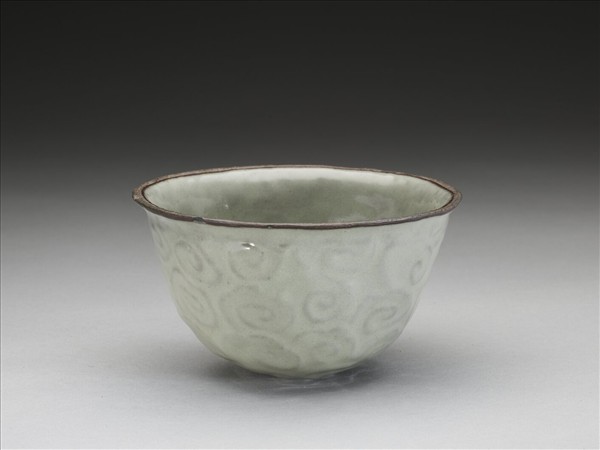 侈口出窄邊,深壁上豐下斂,圓底無足。外壁滿雕雲紋,內壁光素。胎質堅脆,青釉勻潤,口沿未施釉,塗有紫黑色汁。