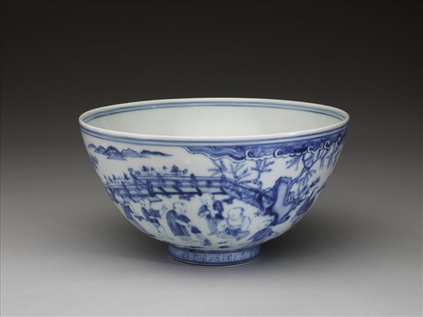 侈口,深壁上豐下削,尖底,矮圈足,通稱蓮子碗。薄胎白釉。外面畫庭園景物,兒童二十人嬉戲其間,足圈畫回紋一周,口足內外分飾青線六道,內面純白無紋飾。