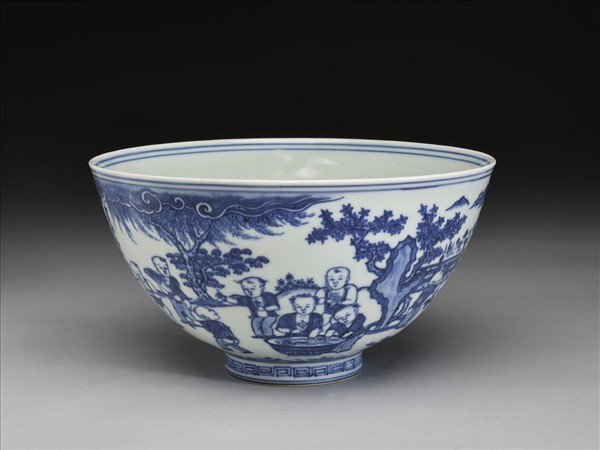 侈口,深壁上豐下削,尖底,矮圈足,通稱蓮子碗。薄胎白釉。外面畫庭園景物,兒童二十人嬉戲其間,足圈畫回紋一周,口足內外分飾青線六道,內面純白無紋飾。