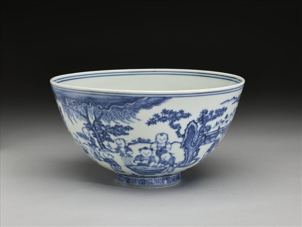 侈口,深壁上豐下削,尖底,矮圈足,通稱蓮子碗。薄胎白釉。外面畫庭園景物,兒童二十人嬉戲其間,足圈畫回紋一周,口足內外分飾青線六道,內面純白無紋飾。