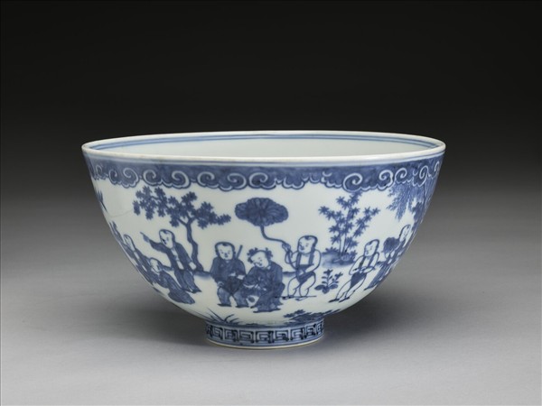 侈口,深壁上豐下削,尖底,矮圈足,通稱蓮子碗。薄胎白釉。外面畫庭園景物,兒童二十人嬉戲其間,足圈畫回紋一周,口足內外分飾青線六道,內面純白無紋飾。