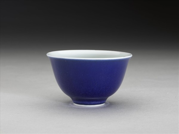 侈口,弧壁,矮圈足。器內壁為白地,光素無紋,外壁施霽青釉,口沿與足邊各留一道白邊。器底為白地,以青花書「乾隆年製」四字二行篆款。