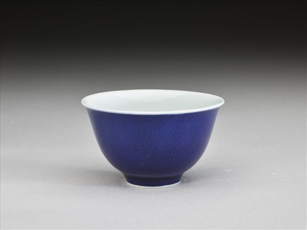 敞口,弧壁,矮圈足。器內壁為白地,光素無紋,外壁施霽青釉,口沿與足邊各留一道白邊。器底為白地,以青花書「大清乾隆年製」六字三行篆款。