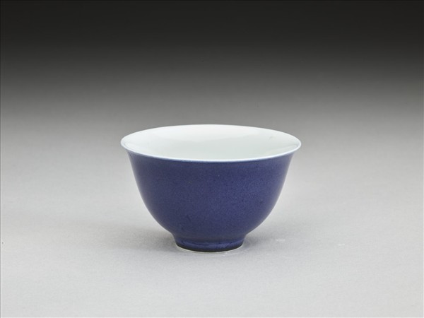 敞口,弧壁,矮圈足。器內壁為白地,光素無紋,外壁施霽青釉,口沿與足邊各留一道白邊。器底為白地,以青花書「大清乾隆年製」六字三行篆款。