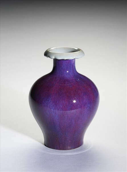 六瓣花形口,短頸,豐肩,斂腹,淺圈足。胎骨厚重,釉色天藍,略變深紫色紋。口唇以內釉色灰青,器底深赭色。底印有「大清乾隆年製」六篆字款。