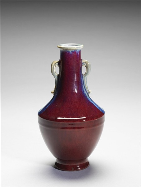 均斂口捲邊,長頸兩耳,寬肩,斂腹,矮圈足。腹飾弦紋一道。胎骨厚重,器面泑色天藍,多變深紫色,兩耳及器內均天青色。器底泑薄,顯露紫色胎。底均印有「大清乾隆年製」六篆字款。